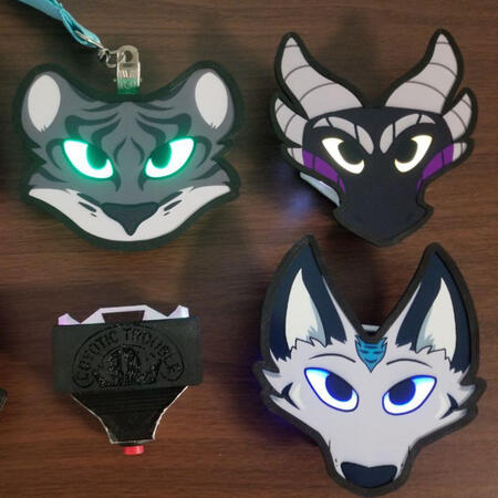We make 3D printed figurines and fursuit addons, like animated fursuit eyes and customizable LED badges. We hope to make more detailed prints and eye commissions in the future, and we're open to interesting projects!